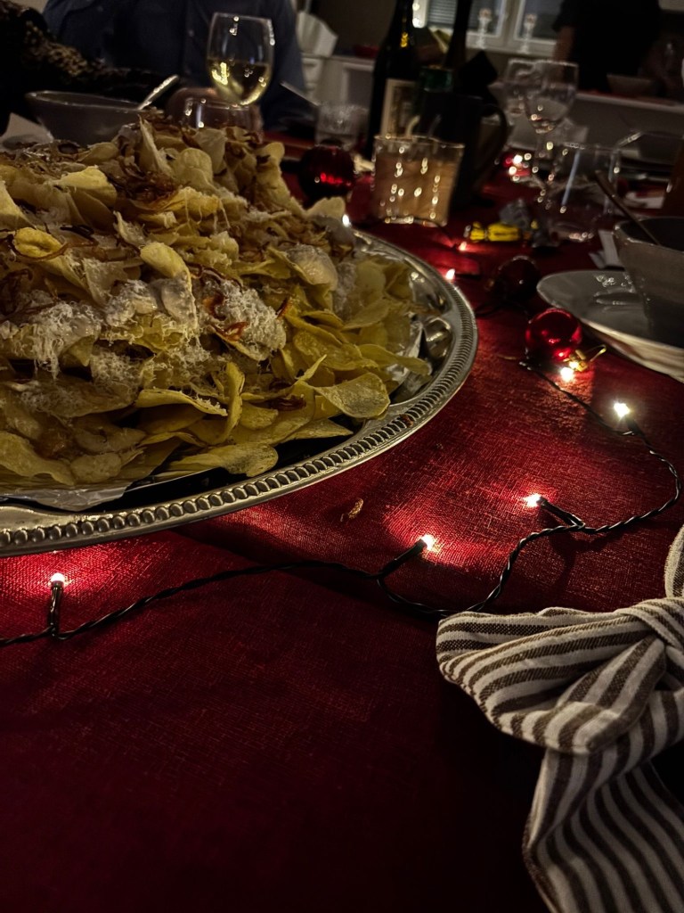 Sipsivuori parmesaanilla, timjamilla ja Glorian Ruoka&viinistä napatulla paahdetulla sipulidipillä ja fritatuilla salottisipuleilla. Umamipommi oli hitti.